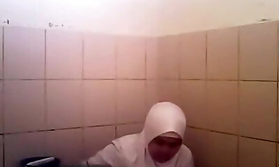 Arab woman goes pee in a public toilet