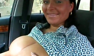 Pale immense breasted dark-haired masturbates her twat on back seat in the car
