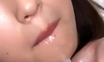 Japanese cutie guzzles a huge mouthful of cum